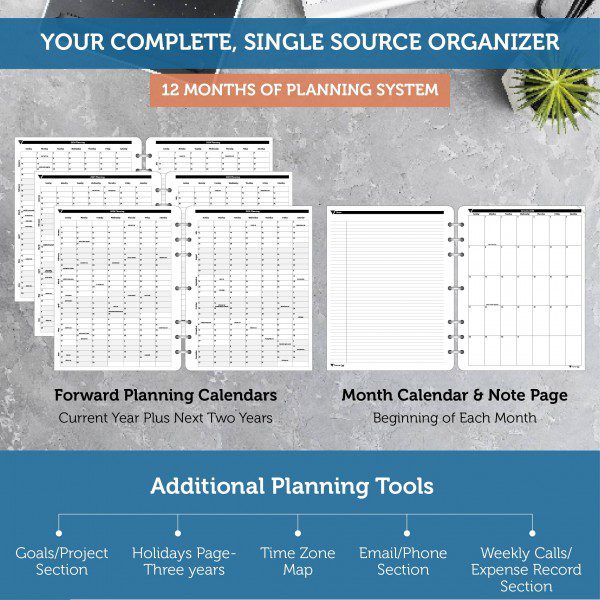Schedule a full year of important activity on a two page spread. You get the current calendar year, plus next two years. Great for planning meetings, deadlines, special projects and vacation time.