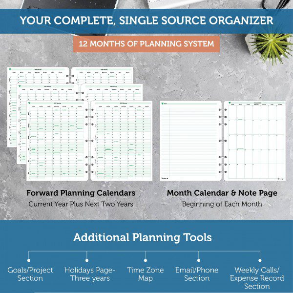 Schedule a full year of important activity on a two page spread. You get the current calendar year, plus next two years. Great for planning meetings, deadlines, special projects and vacation time.