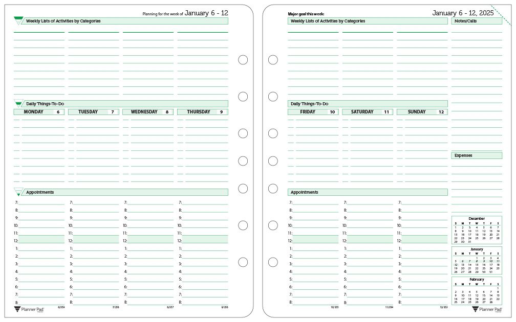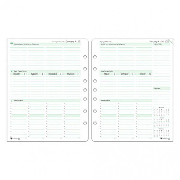 See all your plans for the entire week on two pages. Helps you think in a logical order. Makes it easy to decide what deserves your attention. Funnels events from idea stage to point of action. A productive work flow is established. You work smarter.