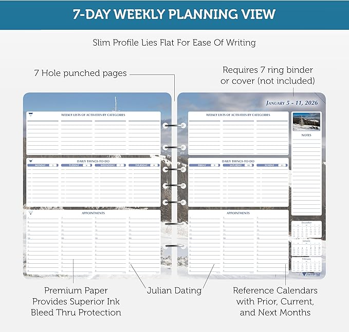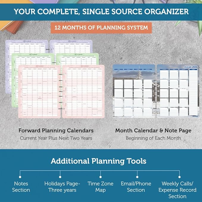Schedule a full year of important activity on a two page spread. You get the current calendar year, plus next two years. Great for planning meetings, deadlines, special projects and vacation time.